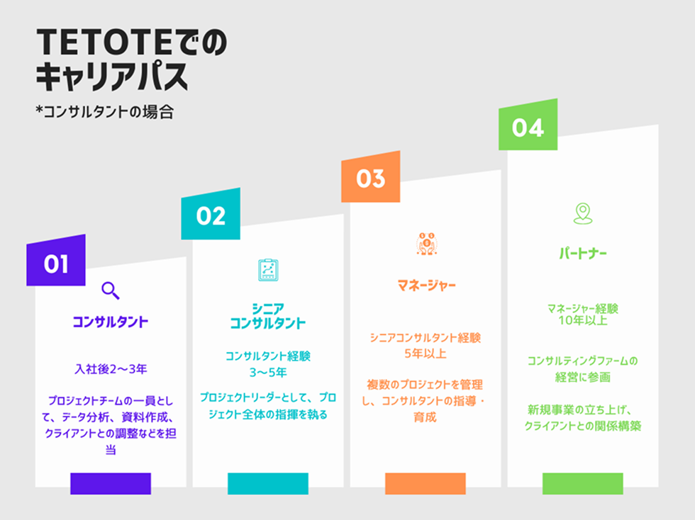 TETOTE は、コンサルタントのキャリアパスを支えるために、以下の独自の研修制度を設けています。